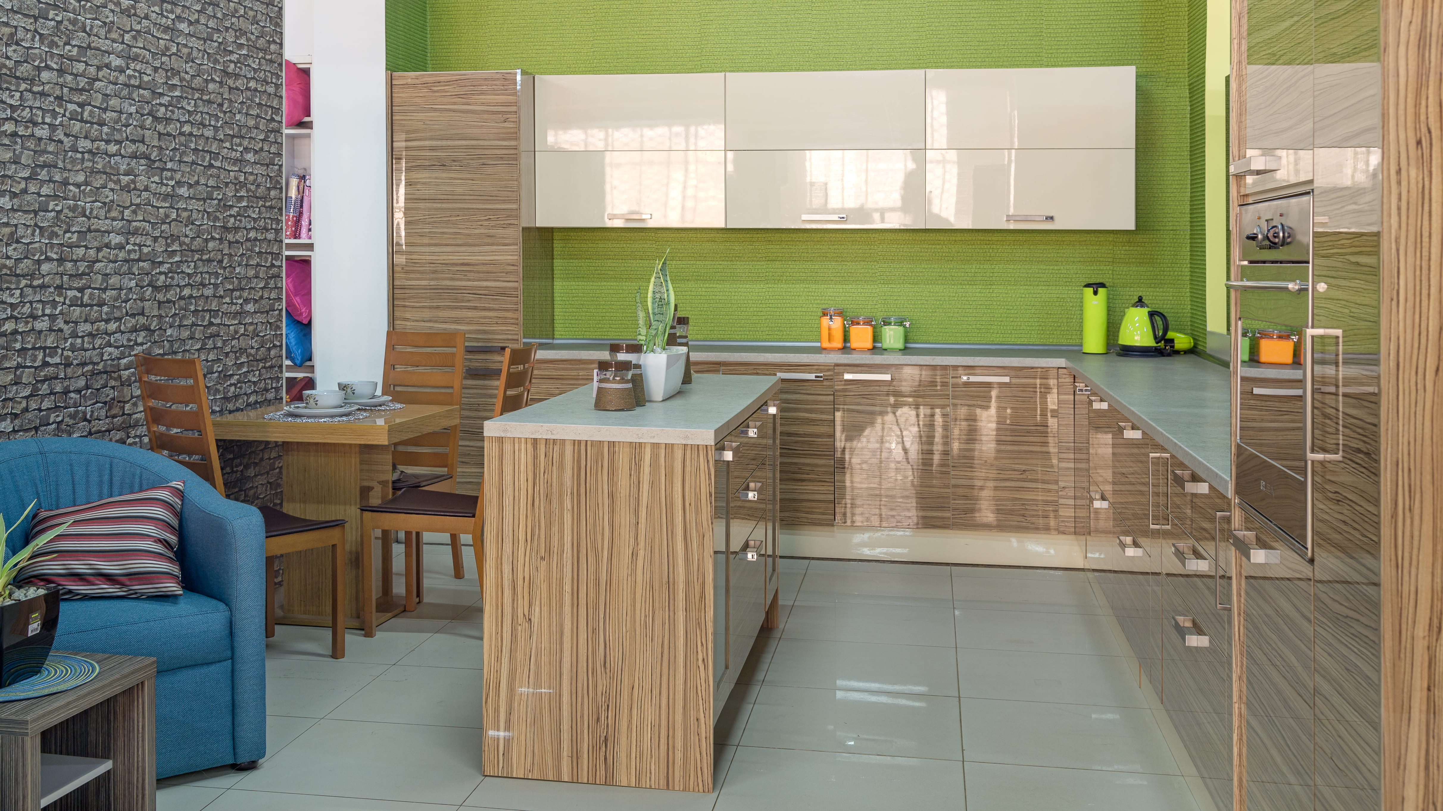 Green themed kitchen with marble table top and island